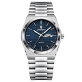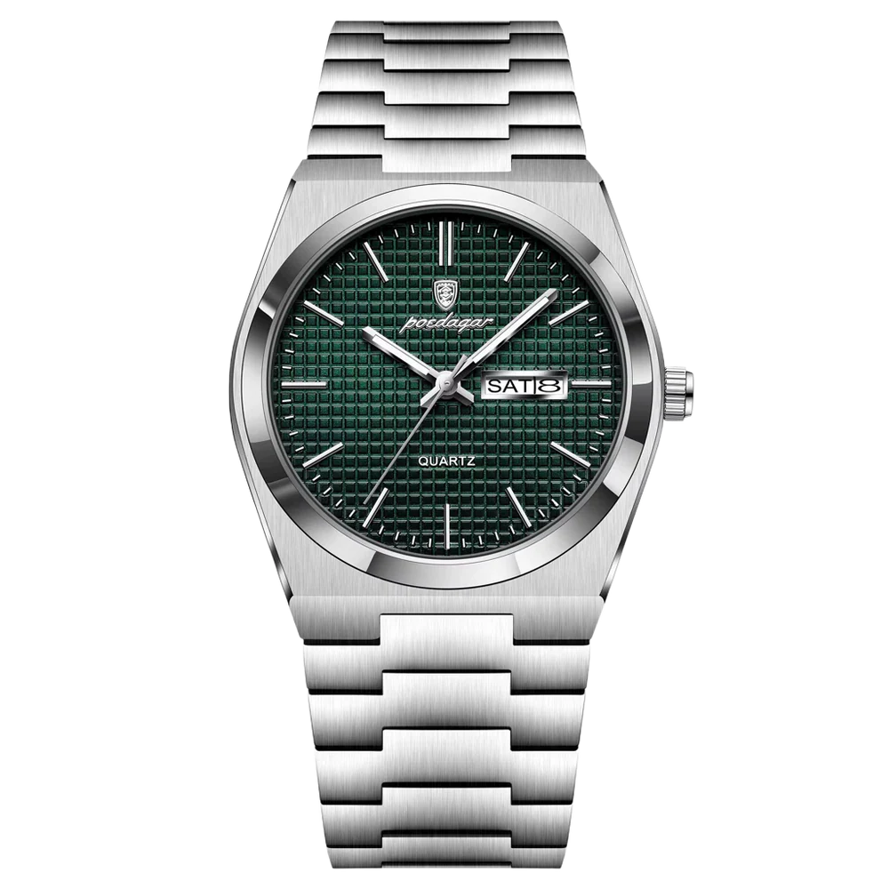 This square-case quartz watch pairs a clean, numberless dial with a stainless steel bracelet for a sharp, composed look. Built with essential calendar functions and water resistance, it delivers clarity and balance for everyday and formal wear.